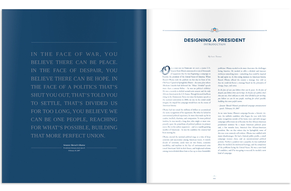 The intention from the get go was to create a book filled predominately with art. The challenge from the beginning was to create a story that spoke to the impressive collection of art work Thomas had collected, while balancing the interests of designers and artists with the generalized and contextual interests of the millions that supported Barack Obama.